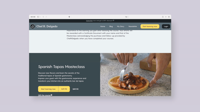 Two years have passed since the first Chef H. Delgado website was launched and the project has steadily grown. In 2022, we filmed and produced a Classic Spanish Tapas online video course. After evaluating options and technologies like Shopify, we chose to build the platform from scratch using React and Next.js.